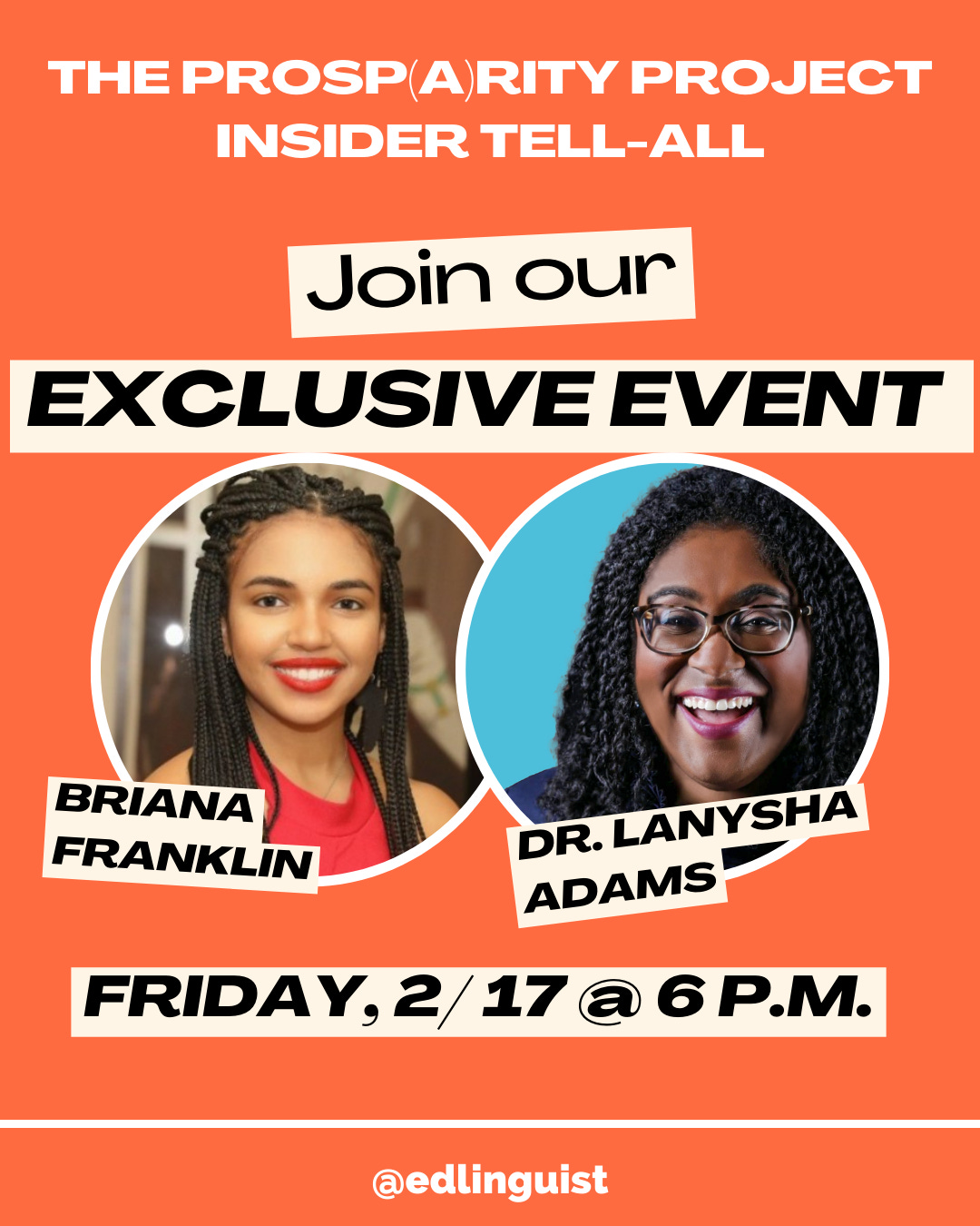If you’re in the DC area on Friday, February 17th, please join our exclusive event welcoming and celebrating Briana B. Franklin’s and The Prosp(a)rity Project team to Washington, DC. I first learned about Briana’s work while researching student loan debt and its impact on black women. The name of her organization caught my eye! The stylization of "prosp(a)rity" is a visual differentiator used to signify the merger of the words prosperity and parity. Under the weight of an estimated $35B in student loan debt, Black women face the greatest threat to building financial literacy and generational wealth. Briana and her team are working to change that.