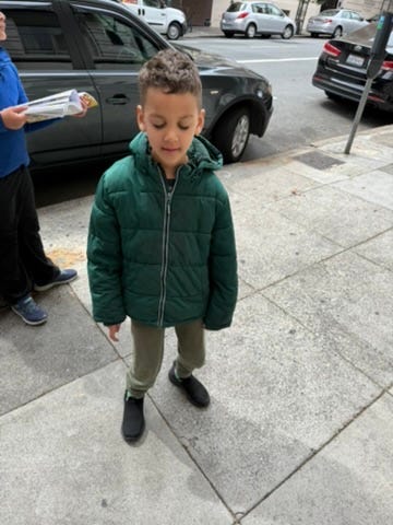 My 5-year-old son wearing two left shoes on the streets of San Francisco, CA.